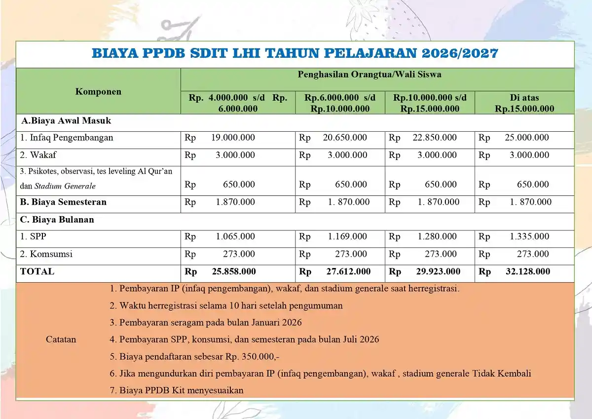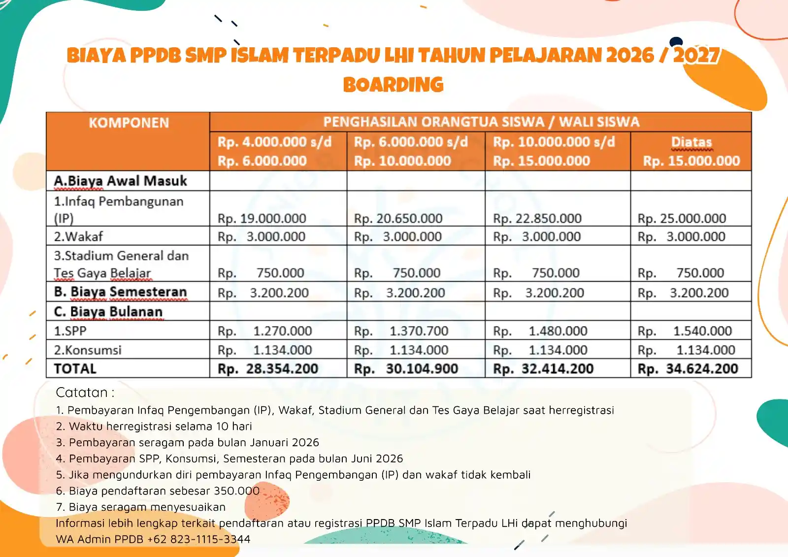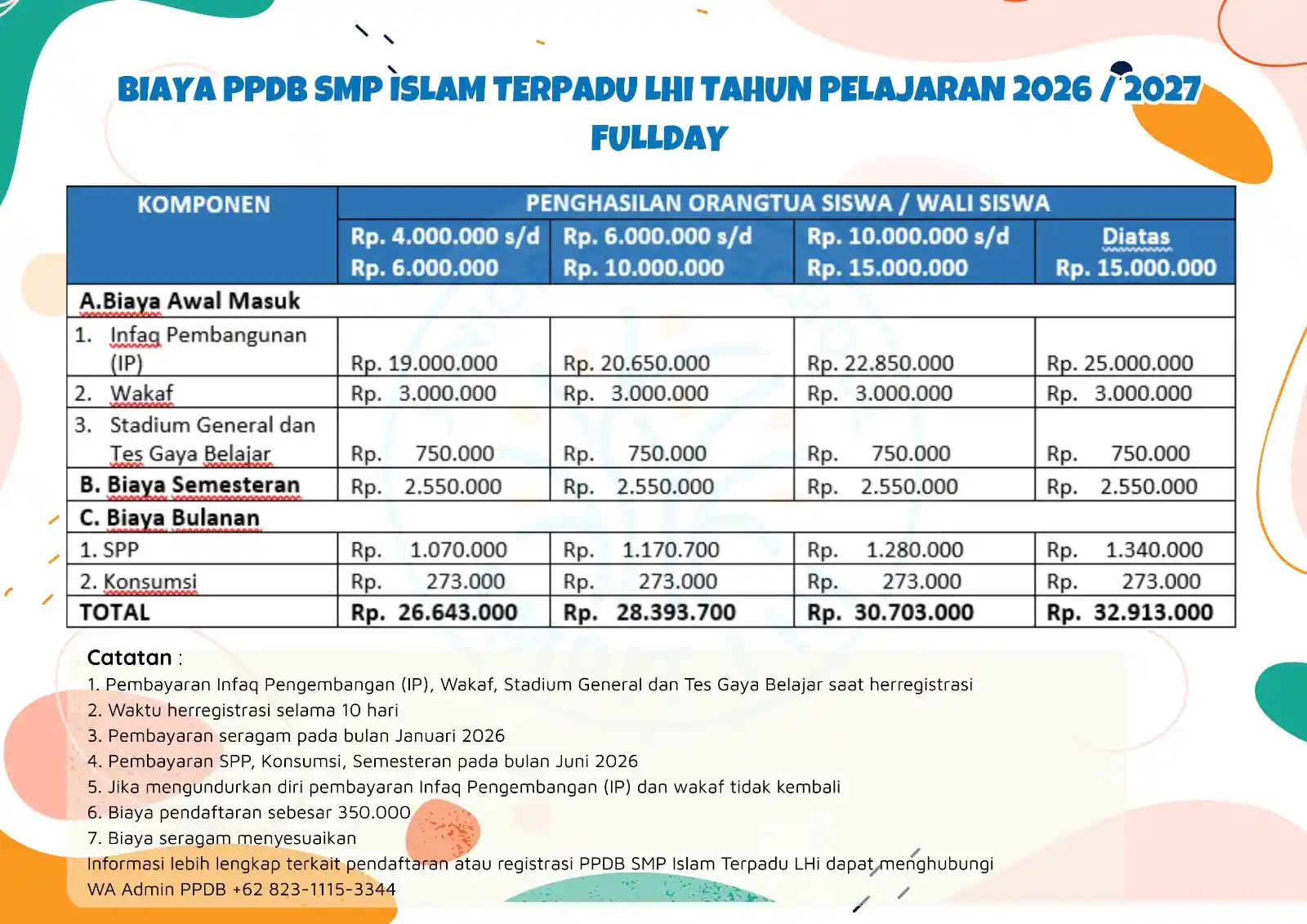 - Besaran biaya infaq Pengembangan yang dibayarkan menyesuaikan dengan penghasilan orang tua calon siswa